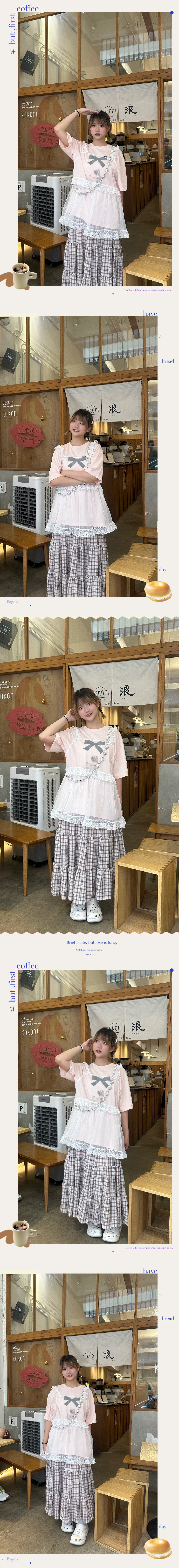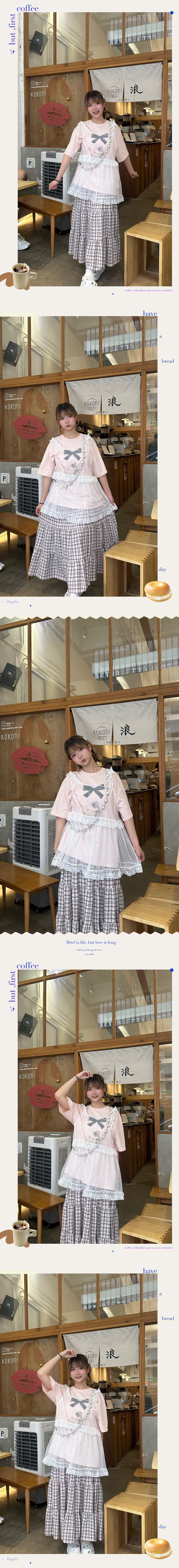 (3月韓國連線) D0360|田園風撞色格紋綁繩蛋糕長裙